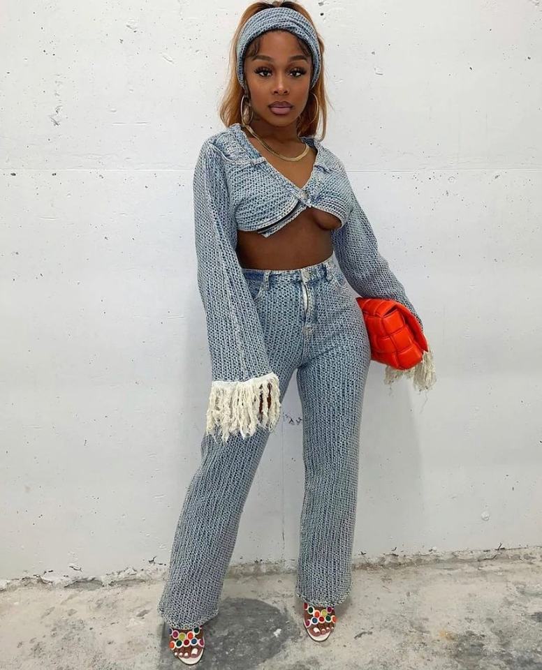 OUDINA High Fashion Long Sleeve Tassel Cropped Jacket 2 Piece Denim Jeans Pants Women Two Piece Denim Set