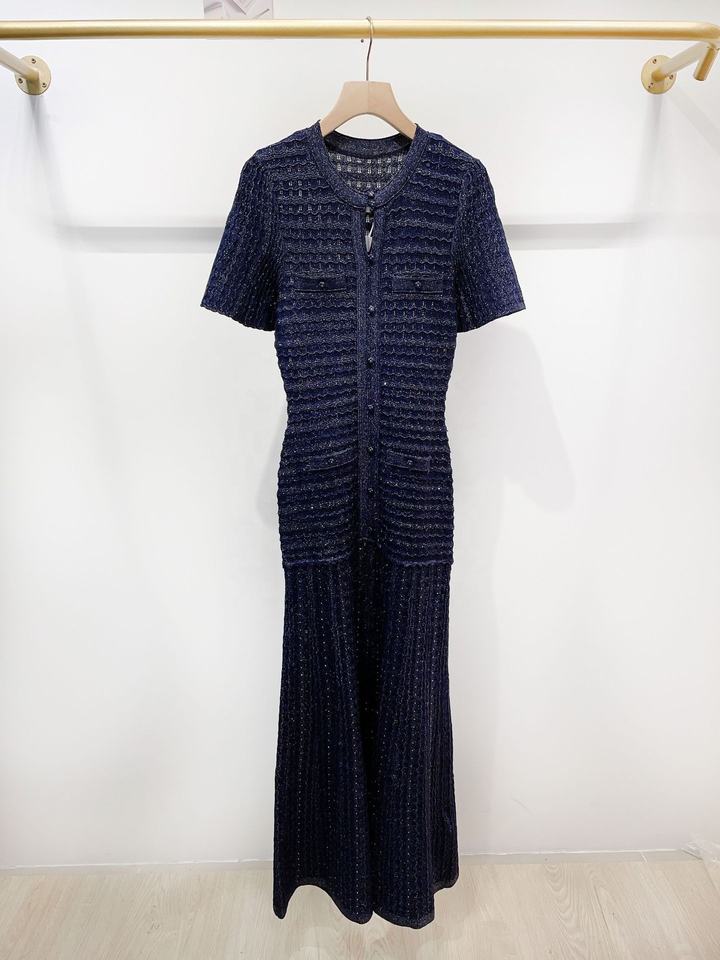 OUDINA Nuovo Abito Lungo Blu Glitterato con Collo Tondo e Maniche Corte, Vestito Elegante Casual in Maglia