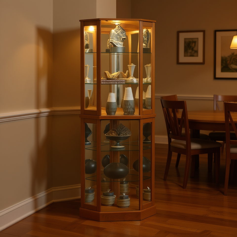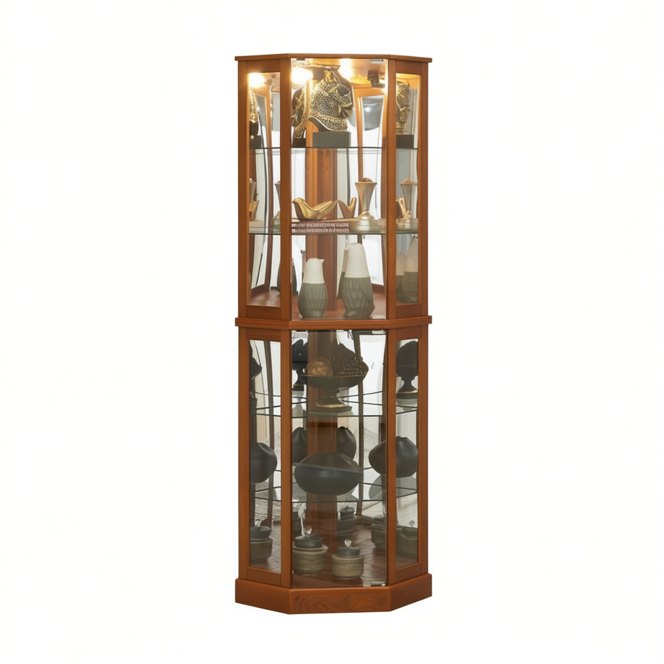 Vetrina Angolare in Quercia con 6 Ripiani, Luci e Specchi, Ripiani Regolabili, Arredamento Moderno per la Casa