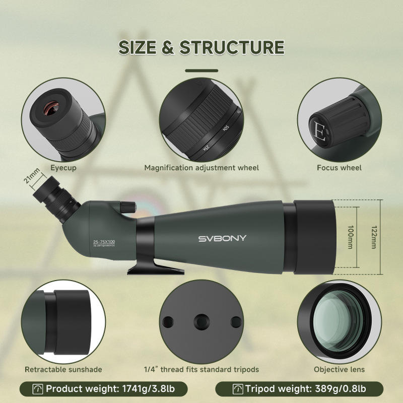 Cannocchiale Monoculare Terrestre con Inclinazione a 45°, Obiettivo da 100mm, Oculare da 18mm, Zoom Variabile 25-75X, Design Ottico FMC e BAK4