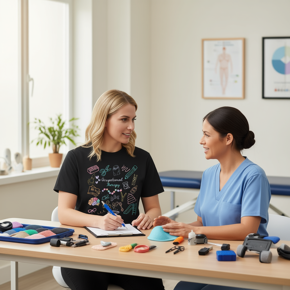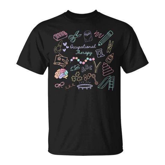 T-shirt per terapia occupazionale, unisex, per adulti, nera, con icone e testo colorati, per terapisti