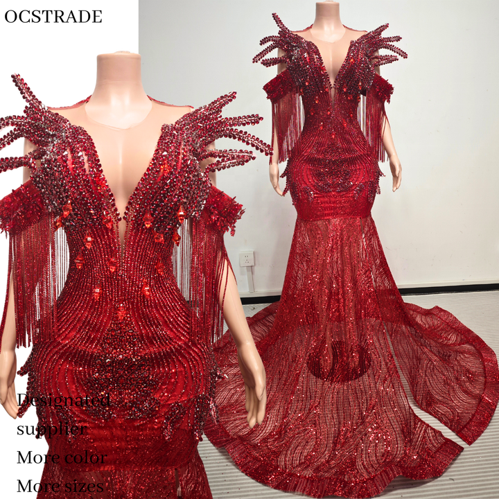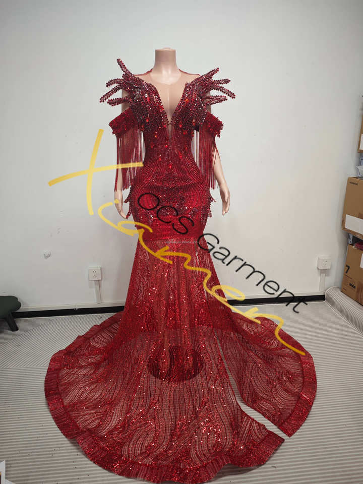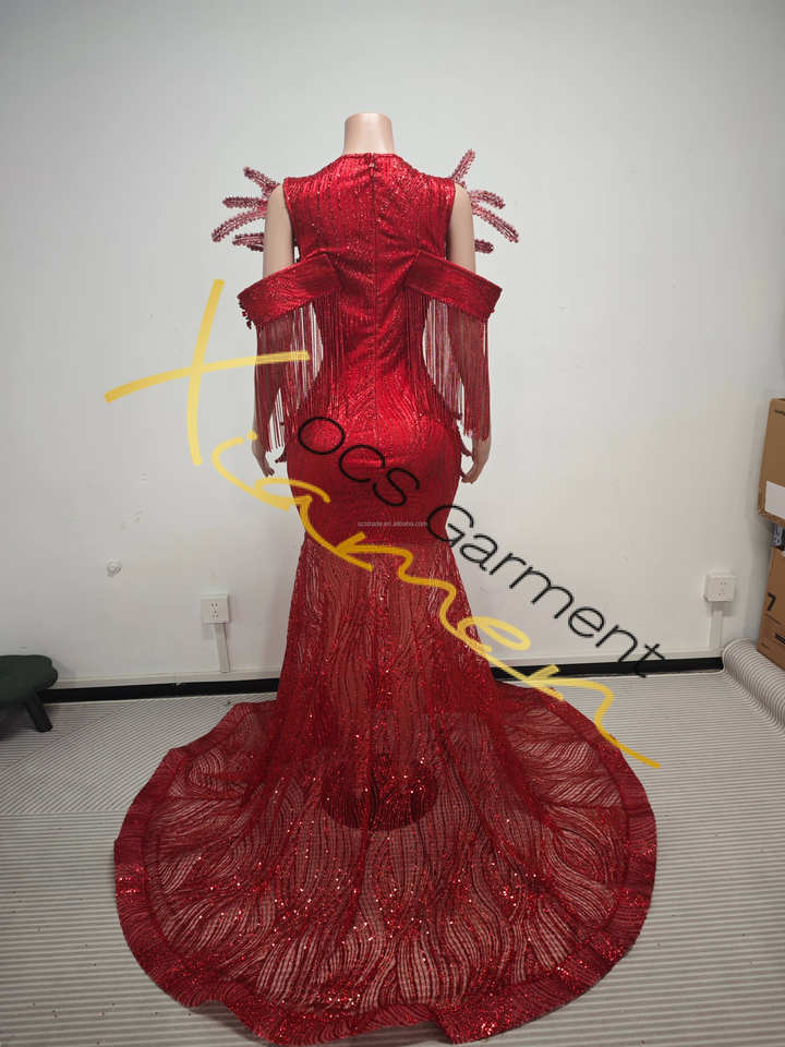 Abito da Sera Elegante Ocstrade Fatto a Mano con Paillettes Rosse, Spalle con Frange, Strass e Spacco, Stile Sirena