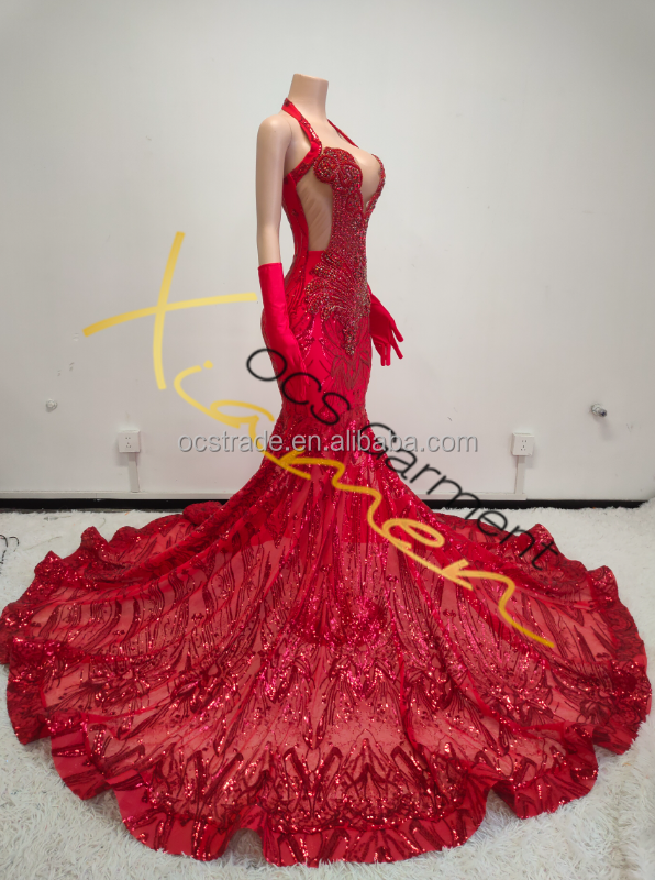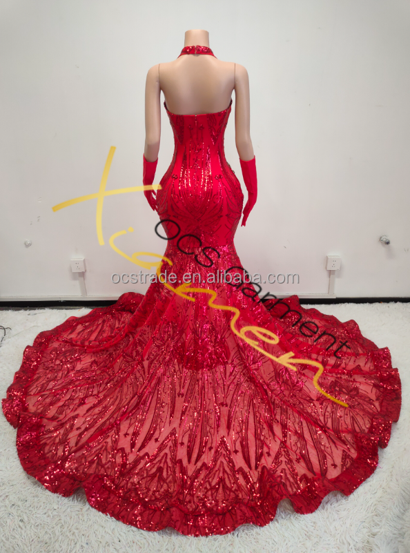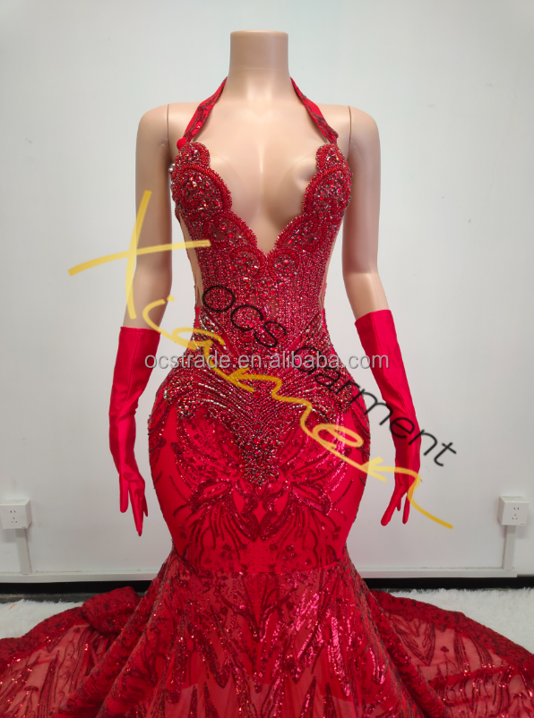 Ocstrade Abiti da Ballo di Alta Qualità in Paillettes Scintillanti Elegante Scollo a V Profondo con Allacciatura al Collo Sexy Sirena Rosso Trasparente con Guanti