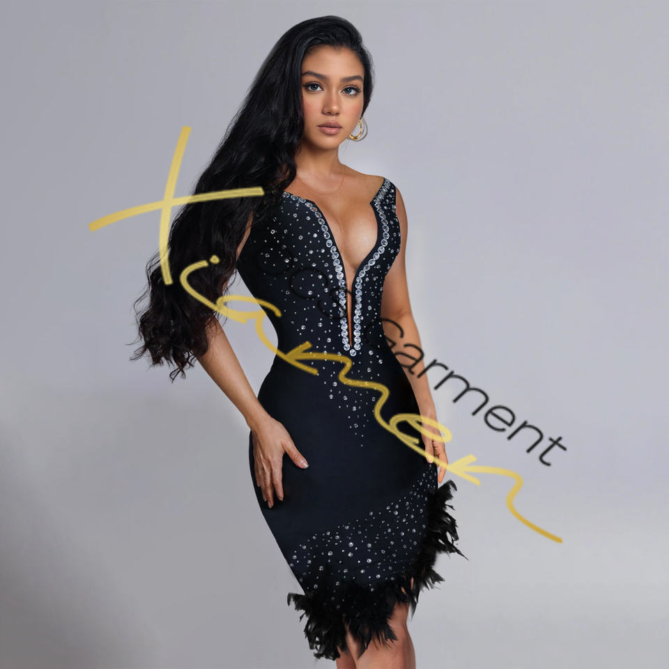 Ocstrade di lusso argento strass con scollo a V abiti da sera eleganti alla moda abiti da Cocktail Midi in piuma nera