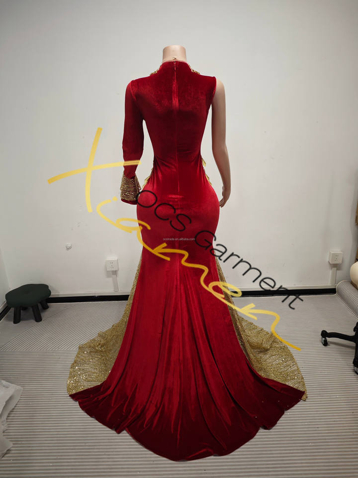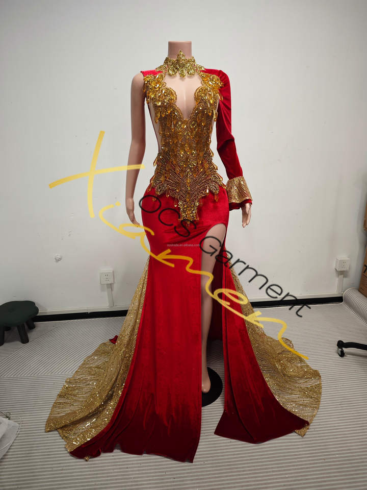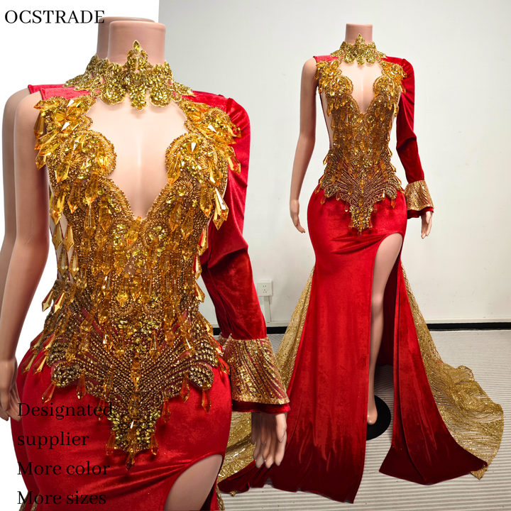 Abito da Sera Elegante Originale di Ocstrade, Lussuoso e Personalizzato, Monospalla con Strass Dorati Scintillanti e Spacco Alto