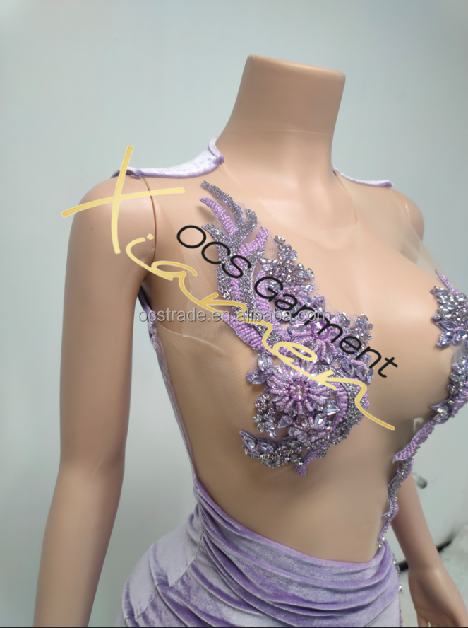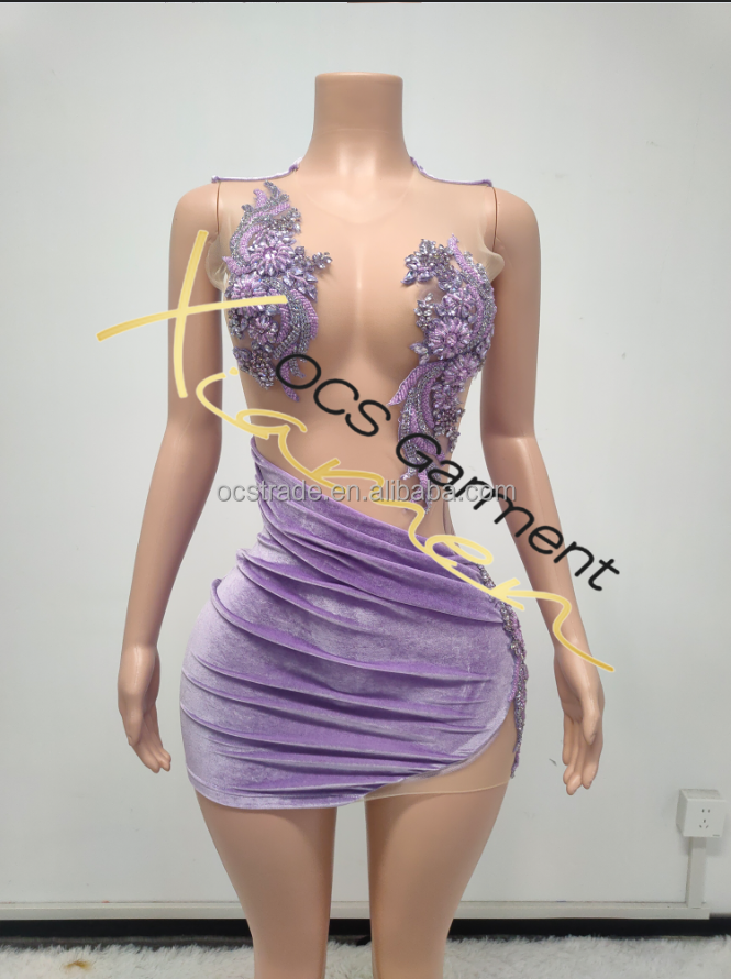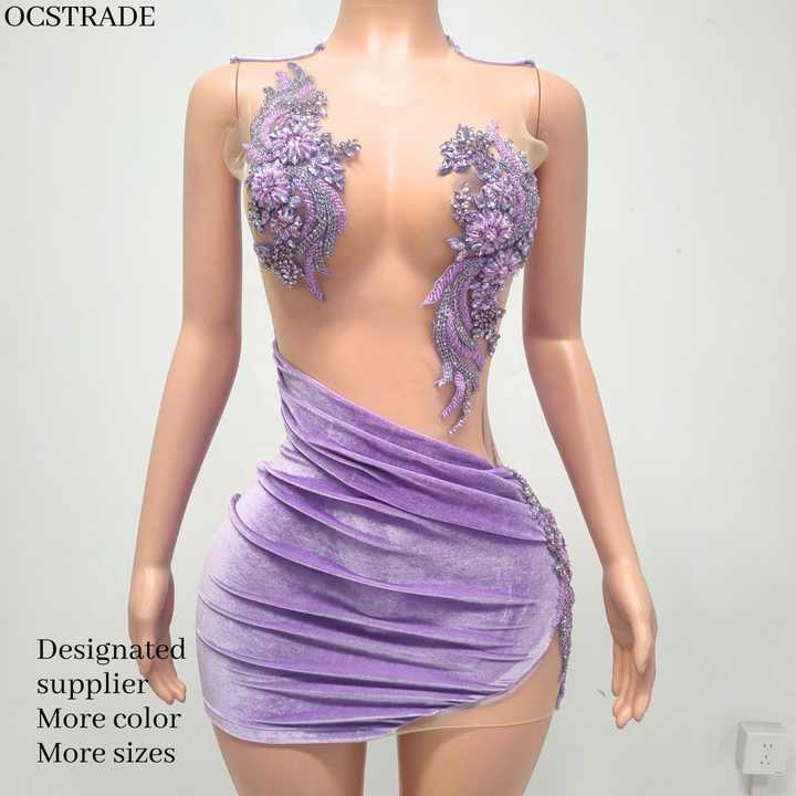 Ocstrade Abito da Compleanno Viola con Ricami Scintillanti e Strass Argento, Elegante Vestito Mini da Donna con Collo a O e Volant per Cocktail Party e Club