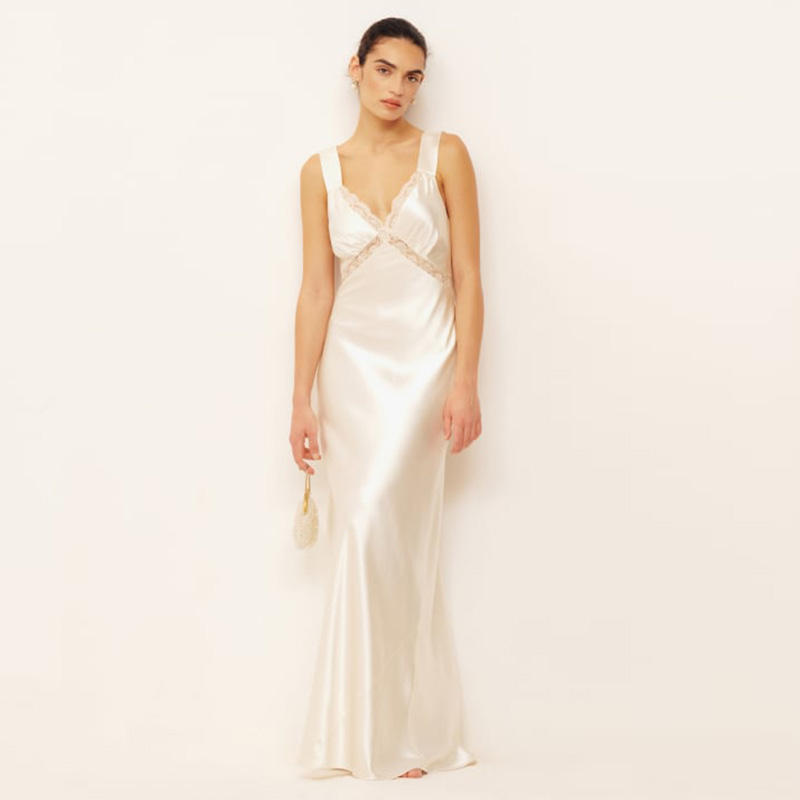 Nuovo Design personalizzato Casual estate scollo a V senza maniche in pizzo intagliato retro solido satinato Maxi abito lungo da donna