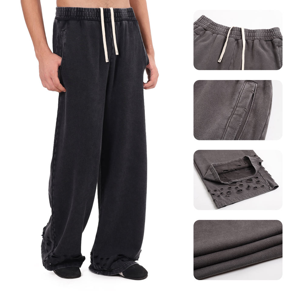 Oem Service Vintage Washed Men's Wide Leg Pants Distressed Pure Cotton High Street Drawstring Pants
