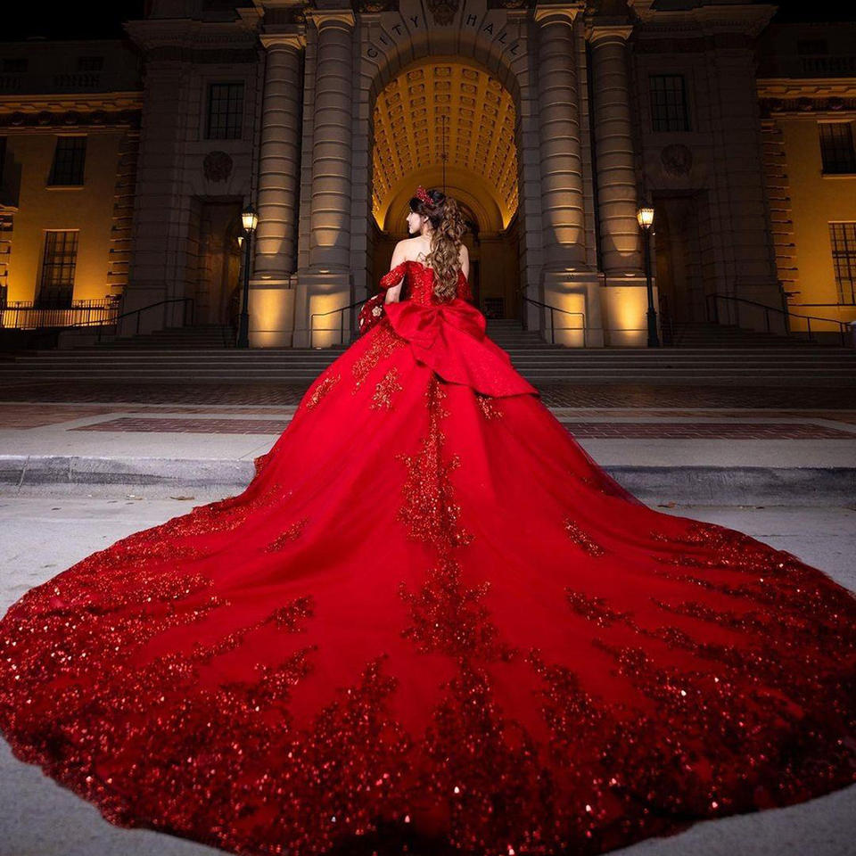 Abito da ballo con perline con spalline e scollo a cuore con paillettes e Quinceanera abiti con fiocco Lsmu38
