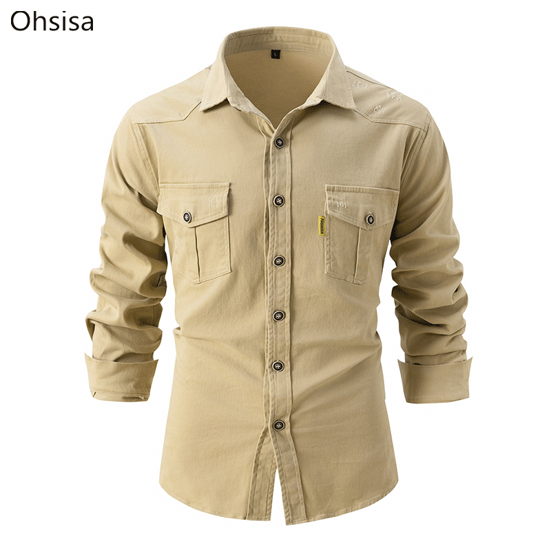 Ohsisa 100% Cotton Multi-pocket and Loose Oversize Long-sleeved Button Shirts Men Blank Business Shirts