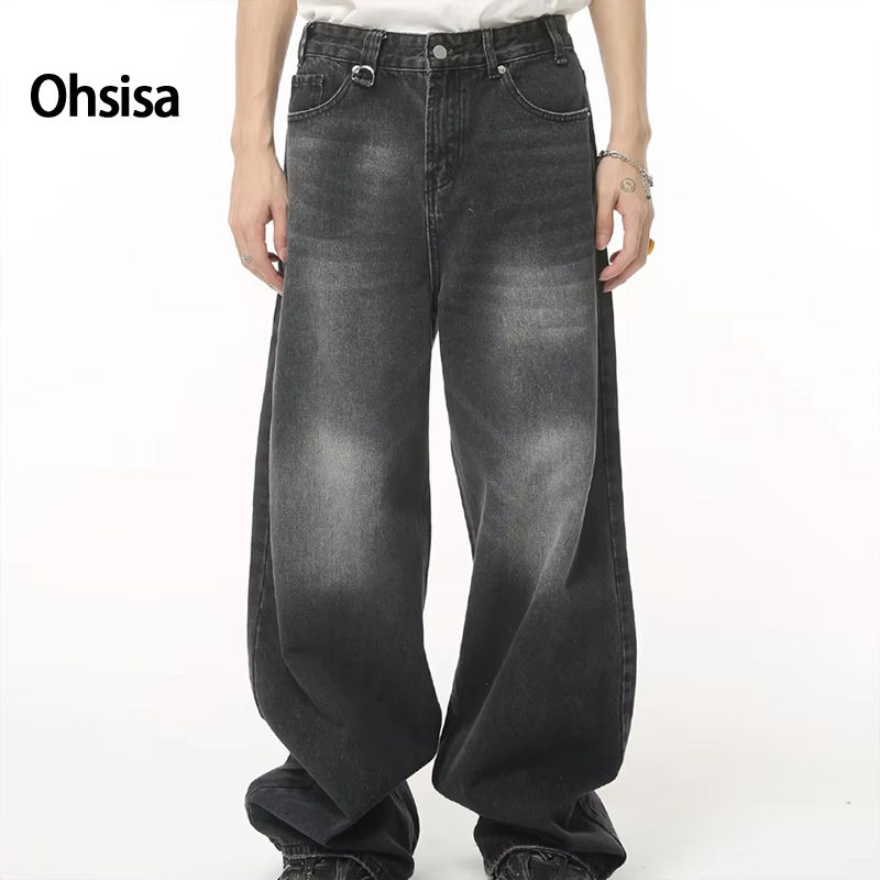 Ohsisa Jeans da Uomo Abbigliamento da Strada Hip Hop Casual Jeans a Gamba Larga Vintage Effetto Pietra Lavato Larghi e Dritti Cargo Baggy per Uomo