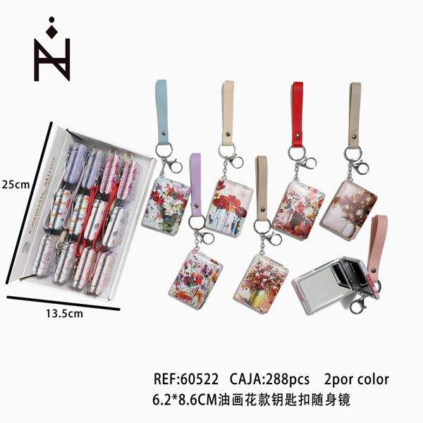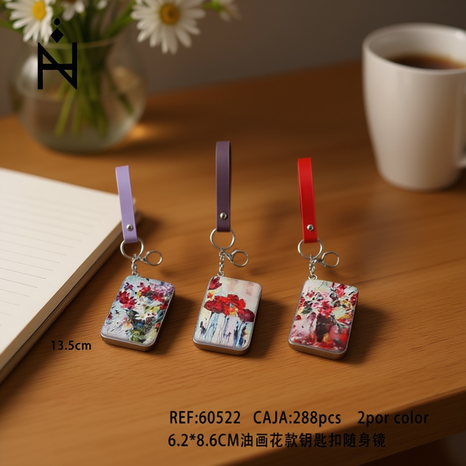 Portachiavi con specchio e pittura a olio floreale 6,2x8,6 cm con cinturino per donna, accessorio moda