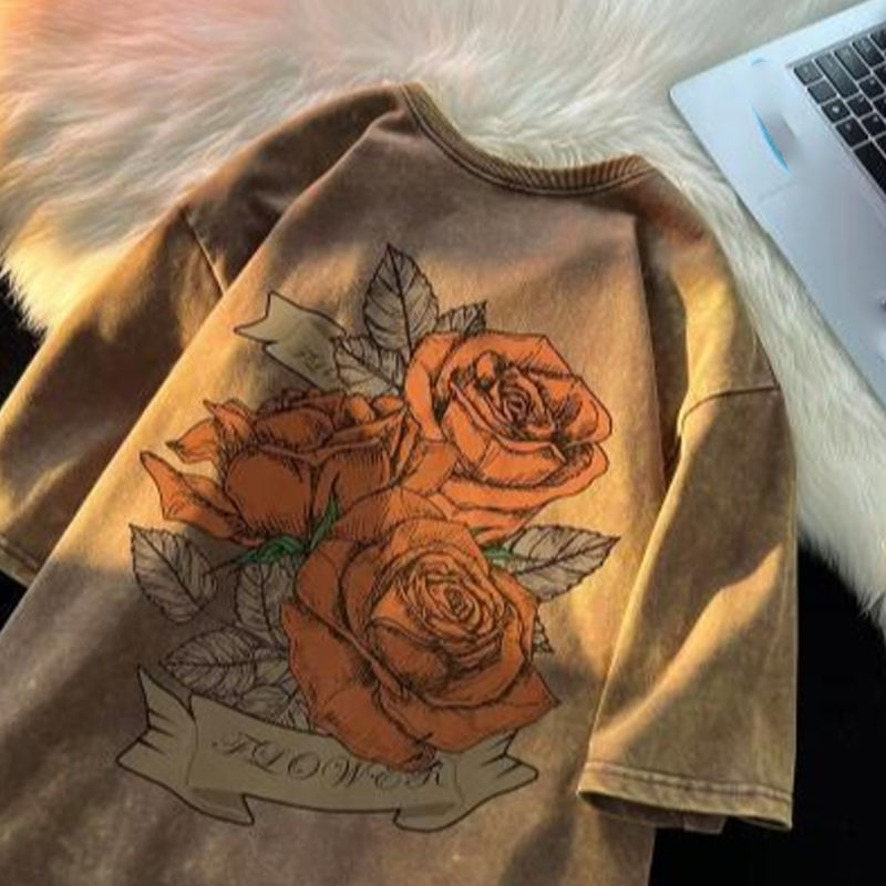 Oil Painting T-shirt Men's Loose American Vintage Clothes Heavyweight Seven-quarter Sleeve Cotton Short Sleeve Men's Clothing