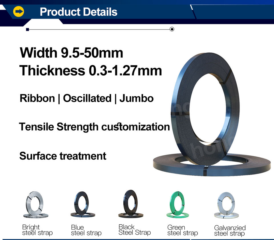 Vecchia categoria: Nastro di imballaggio in acciaio al carbonio per carichi di legname, blu temperato, laminato a freddo, 0,8 mm-25 mm, nastro metallico di qualità.