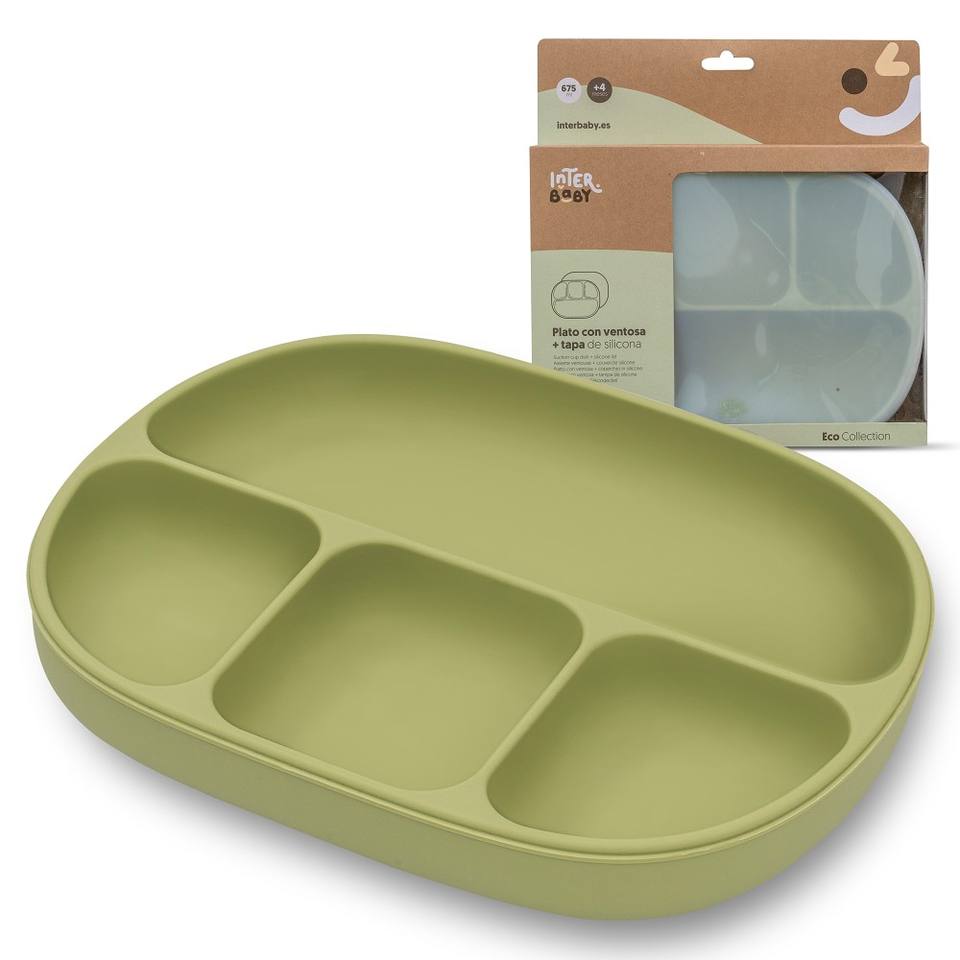Piatto in silicone Oliver Green con ventosa e coperchio per bambini da 0 a 12 mesi