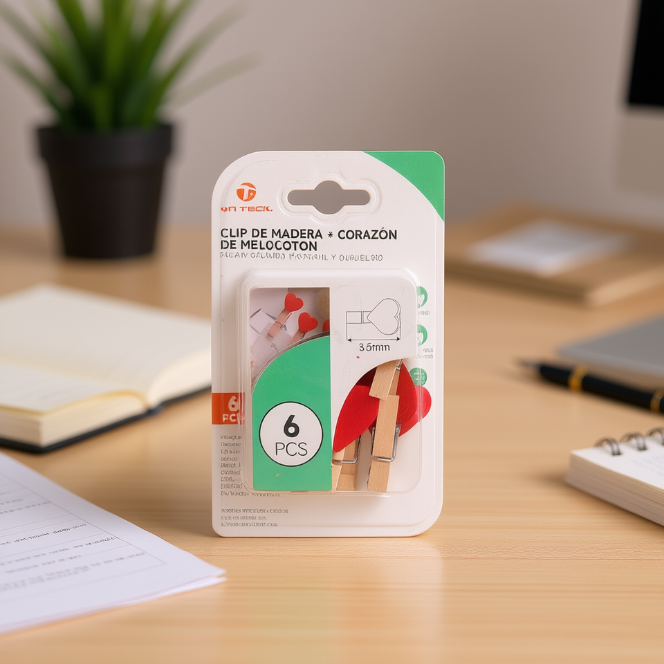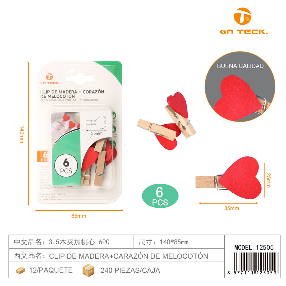 Clip in legno On Teck da 35 mm a forma di cuore color pesca, 6 pezzi, non magnetici, per l'organizzazione dell'ufficio