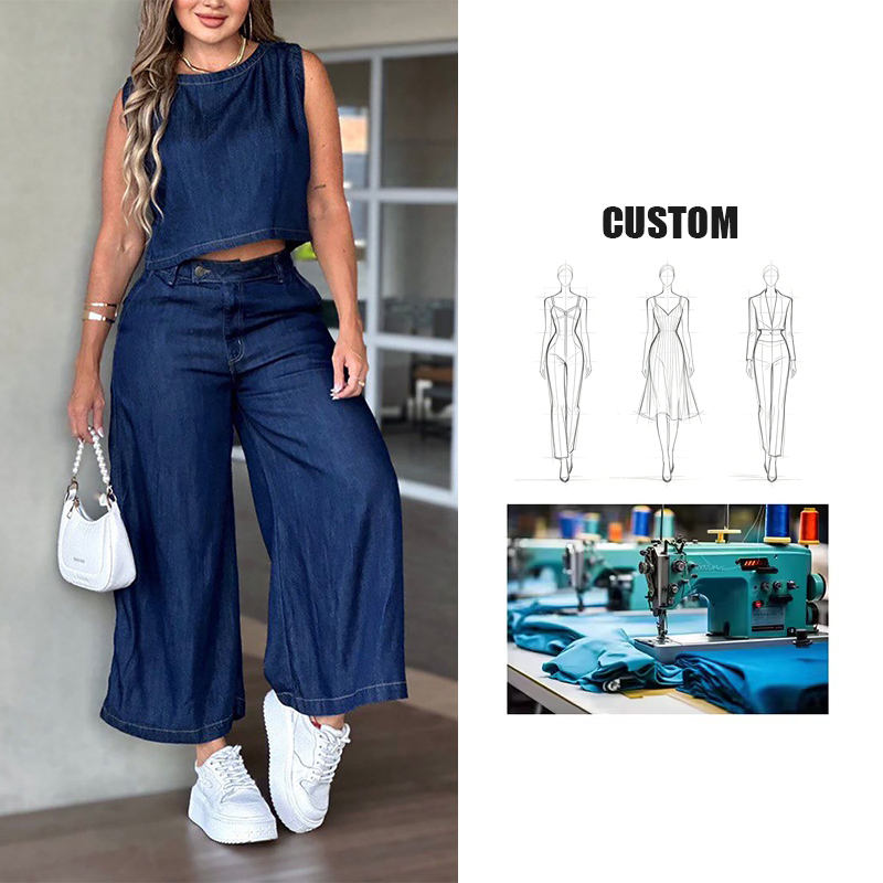 Completo casual da donna in denim indaco scuro: camicia senza maniche e pantaloni a gamba larga coordinati