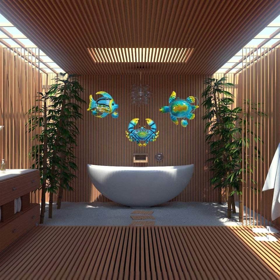 Oniya Beach Metal Ocean Wall Decor Set of 3 Blue Metal Sea Turtle Fish Crab 3D Wall Art Sculpture Indoor for Home Decoration