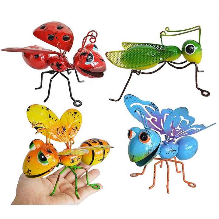 Oniya Metal Garden Yard Art Hanging Decoration Set of 4 Include Yellow Bee Blue Butterflies Red Ladybug and Green Mantis Decor