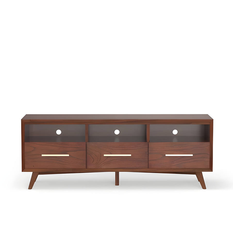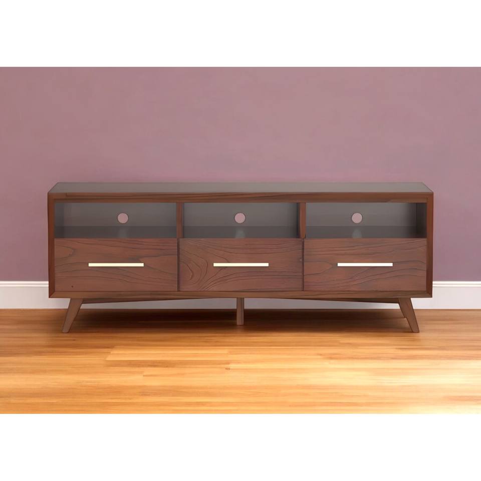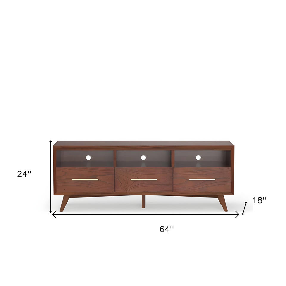 Open Shelving TV Stand 64\" Brown Mahogany Solid Wood MDF Panel Modern Vintage Design Foldable Movable for Bedroom Farmhouse Use