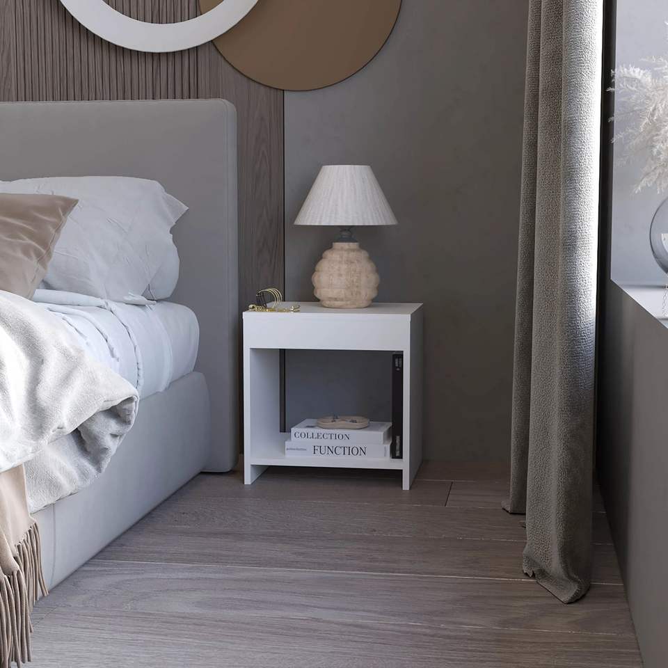 Comodino Bianco con Vano Portaoggetti Aperto