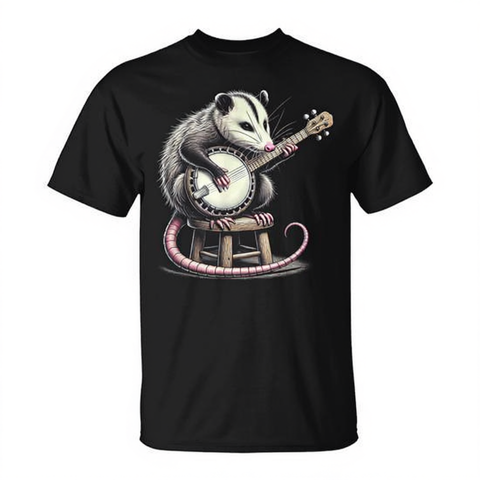 T-shirt Opossum che suona il banjo, per adulti, unisex, nera, girocollo, manica corta, stampa digitale, design musicale con animali