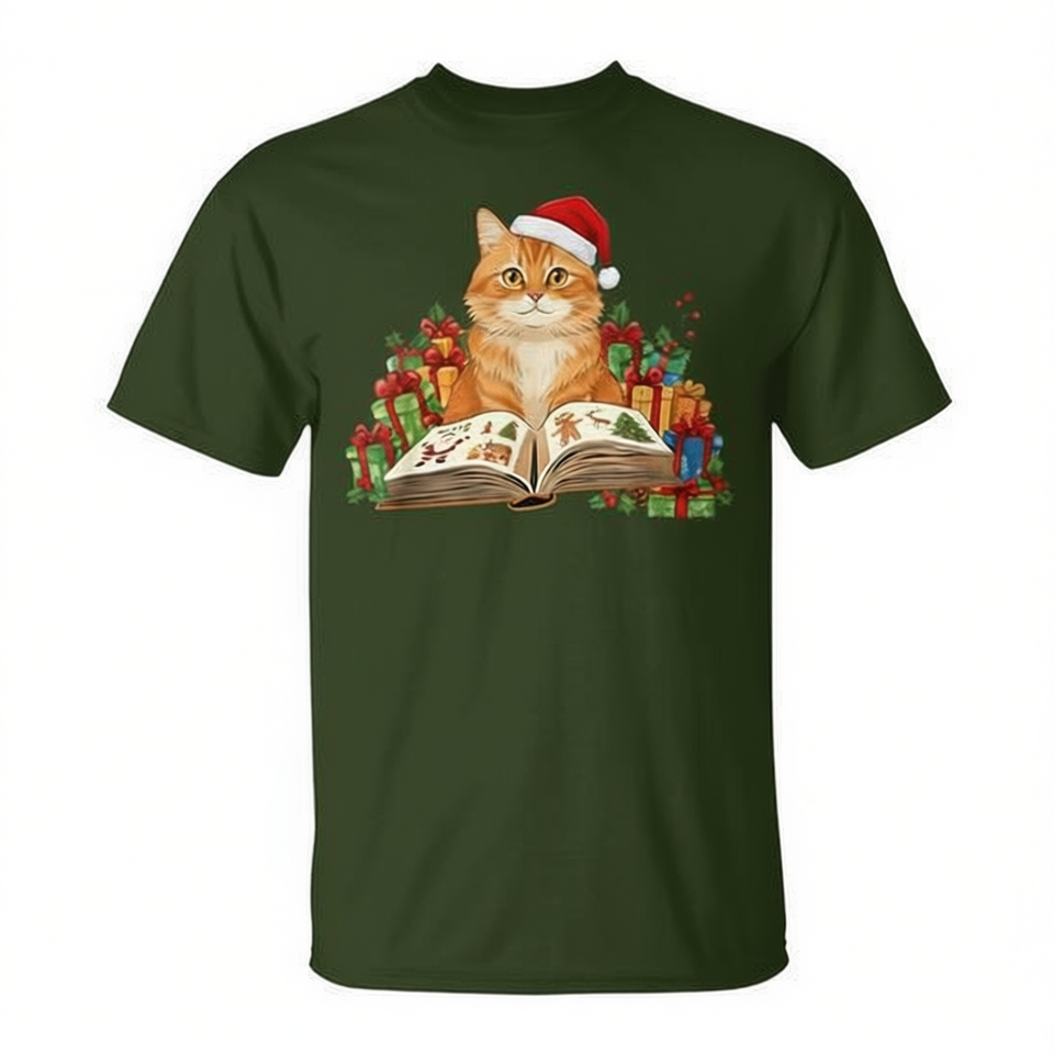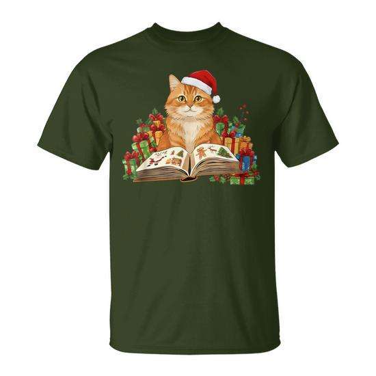 T-shirt natalizia per amanti dei gatti con gatto arancione che legge un libro e cappello da Babbo Natale