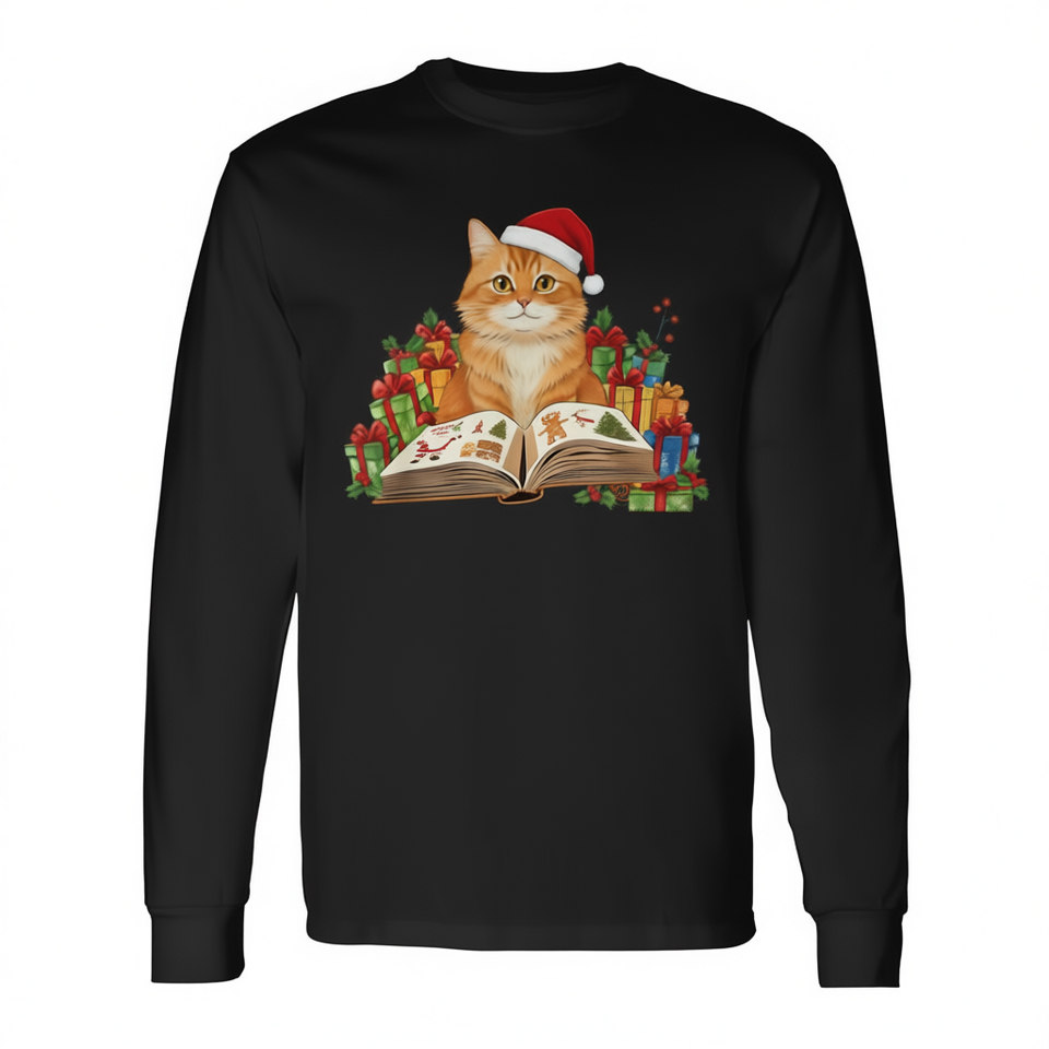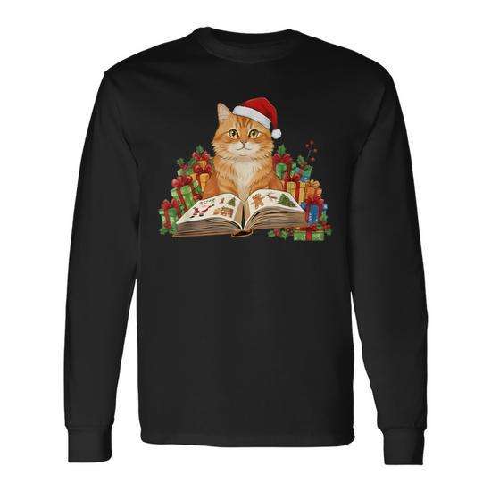 T-shirt a maniche lunghe natalizia con gatto arancione che legge un libro e cappello da Babbo Natale per amanti dei gatti