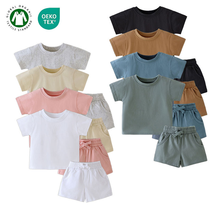 Organic Cotton Summer Blank Short Sleeve Top and Pants 2pcs Set Baby Girls Suit Boys Kids Children Clothing Set