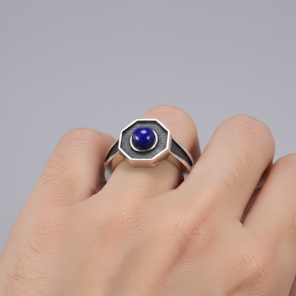 Anelli in Argento Sterling 925 Design Originale per Uomo e Donna con Pietra Naturale di Lapislazzuli a Forma Esagonale, Gioiello Elegante