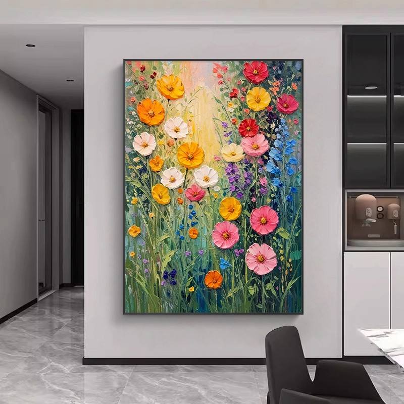 Original Garden Painting on Canvas 3D Texture Green Wall Art Colorful Flower Painting Living Room Teal Luxurious Floral Art
