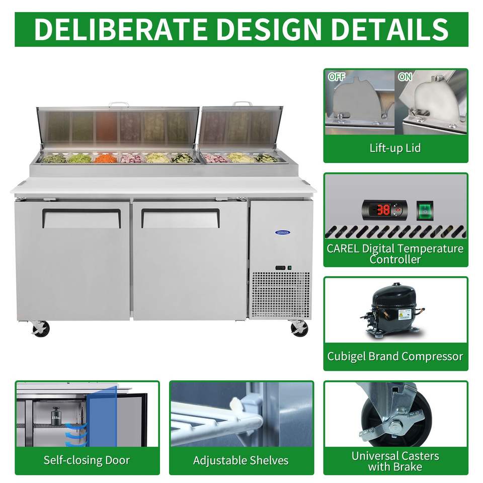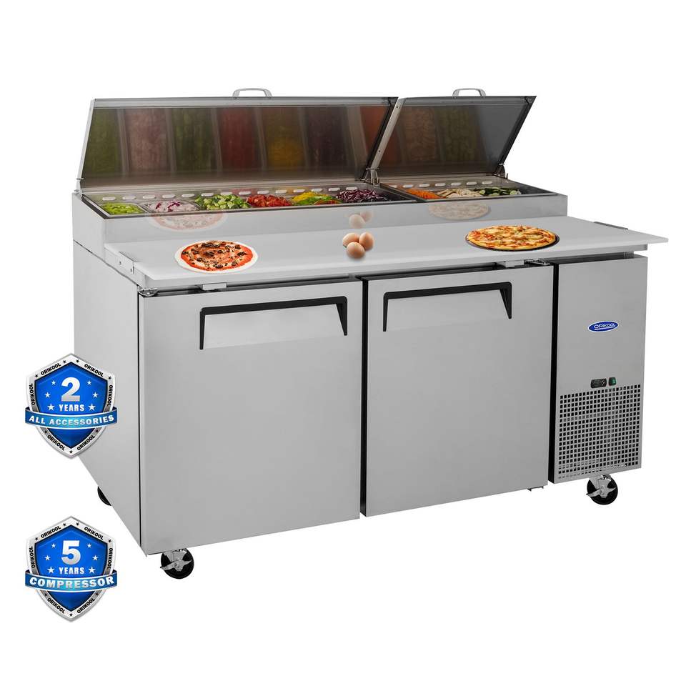 Orikool 67 Attrezzatura di Refrigerazione Commerciale per Cucina, Frigorifero Integrato da 20,3 Cu.Ft, Tavolo per Preparazione Pizza, Banco da Macellaio per Taglio