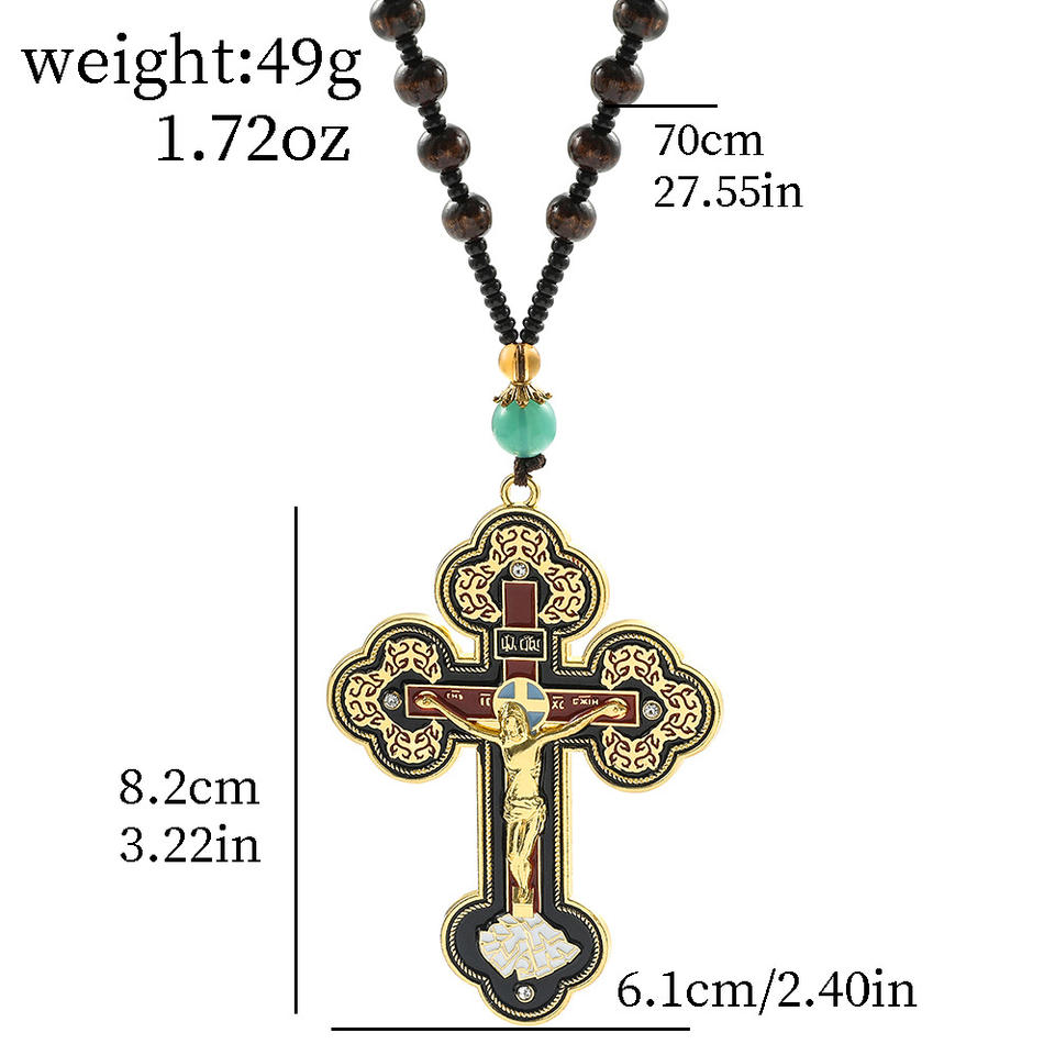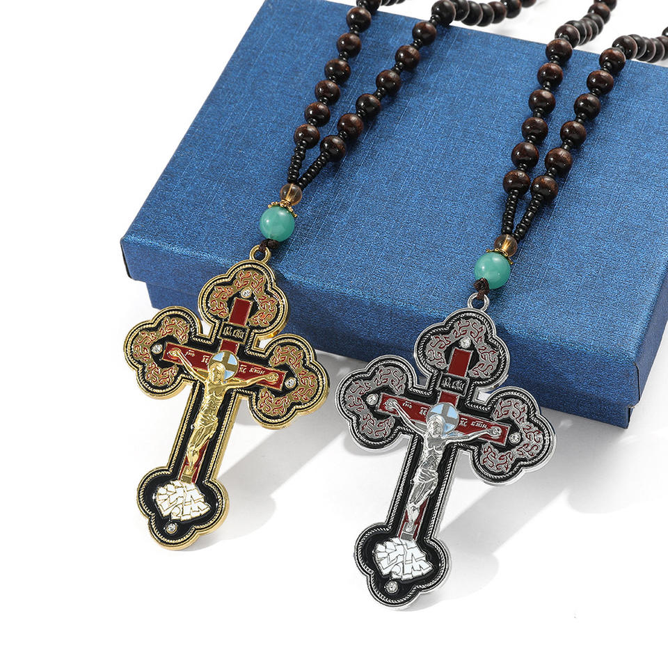 Orthodox Crucifix Pendant Necklace with Wooden Beads Gold and Silver Tone Cross with Jesus Christian Religious Jewelry Men Women
