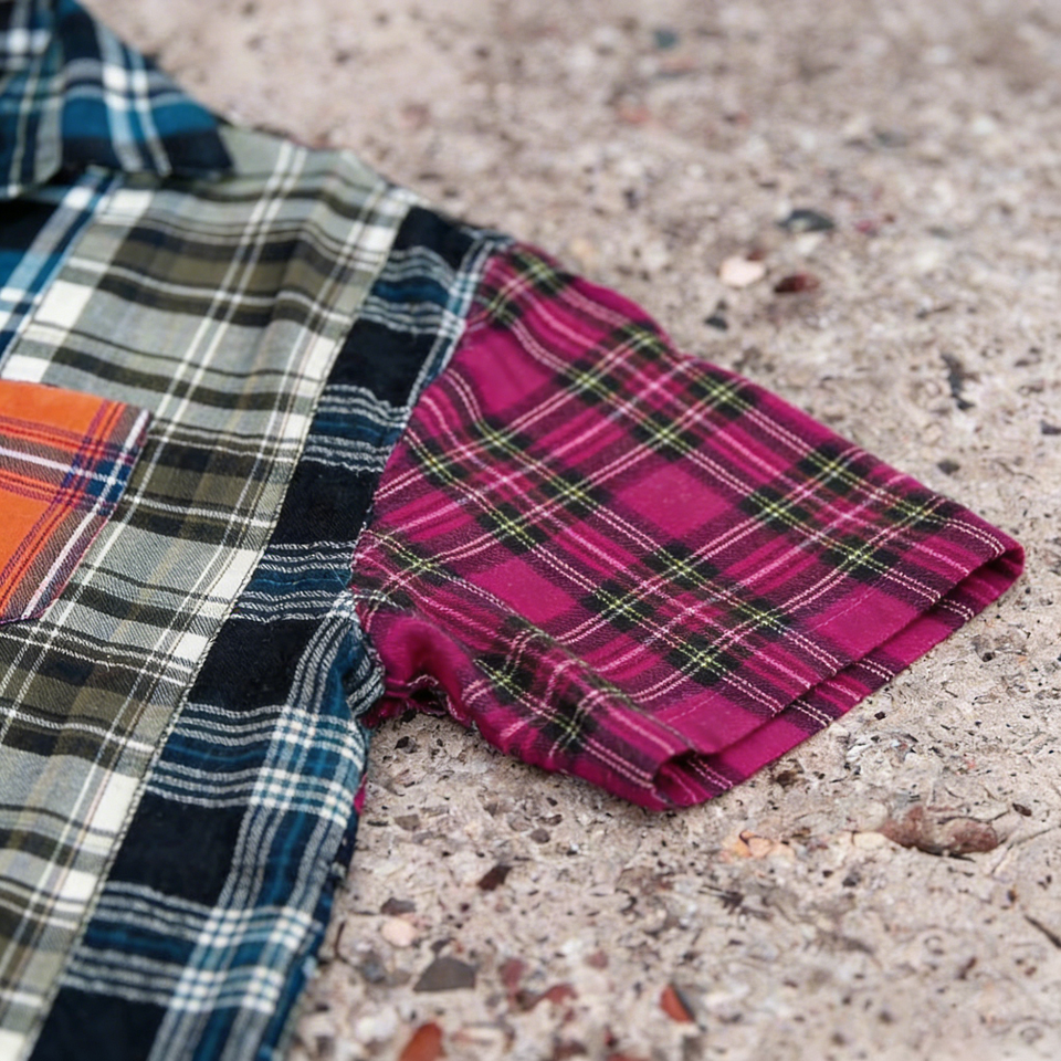 Camicia in Flanella a Quadri Multicolore Personalizzata Ouna, Manica Corta con Stampa e Bottoni per Uomo