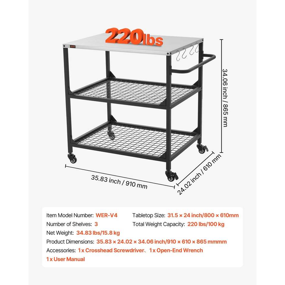 Carrello per Barbecue da Esterno a 4 Ruote con Piano di Lavoro in Acciaio Inox 31,5 X 24,0 Pollici, Tavolo da Cucina per Esterni