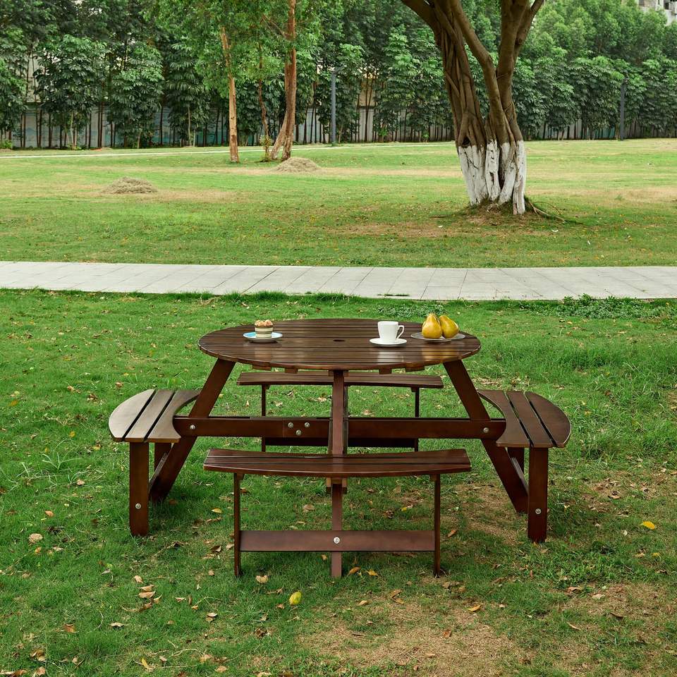Tavolo da Picnic Rotondo per 6 Persone con 3 Panche Integrate e Foro per Ombrellone, Set Tavolo e Panche da Giardino per Picnic