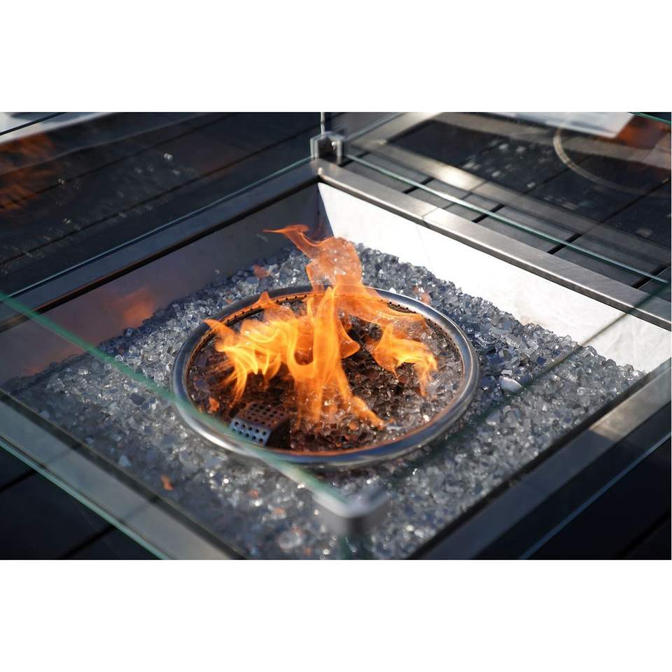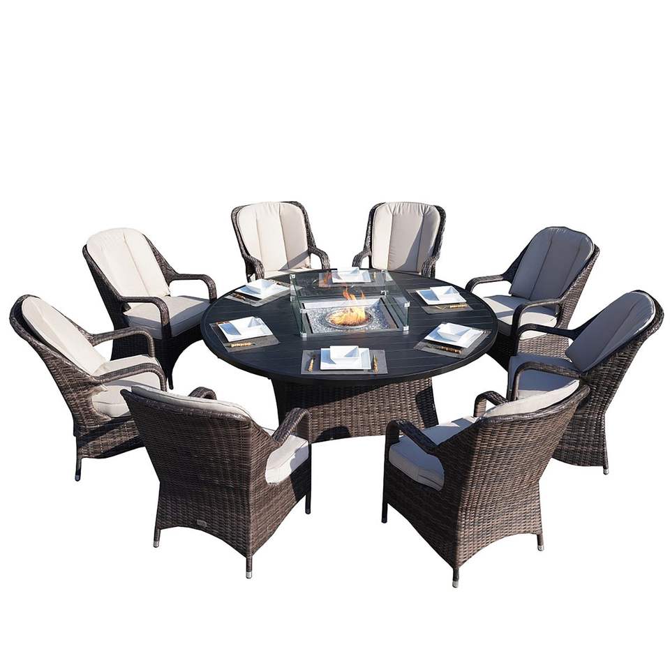 Set di Mobili da Esterno in Vimini Marrone a 9 Pezzi con Tavolo Rotondo con Braciere a Gas e Sedie con Braccioli