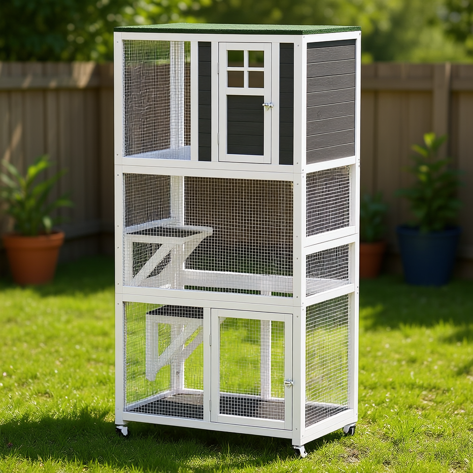 Cuccia per gatti da esterno con tetto protettivo dalle intemperie, recinto in legno da 36 pollici con 2 piattaforme e ruote per gatti
