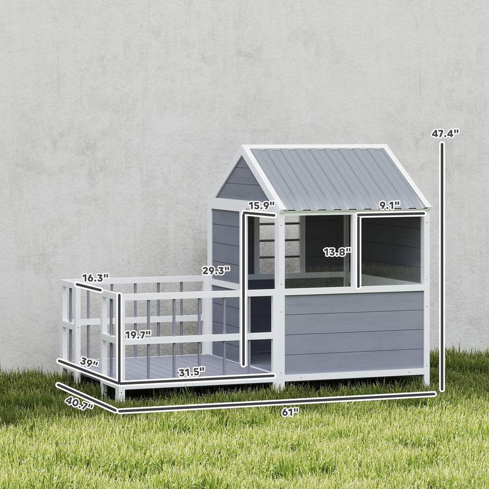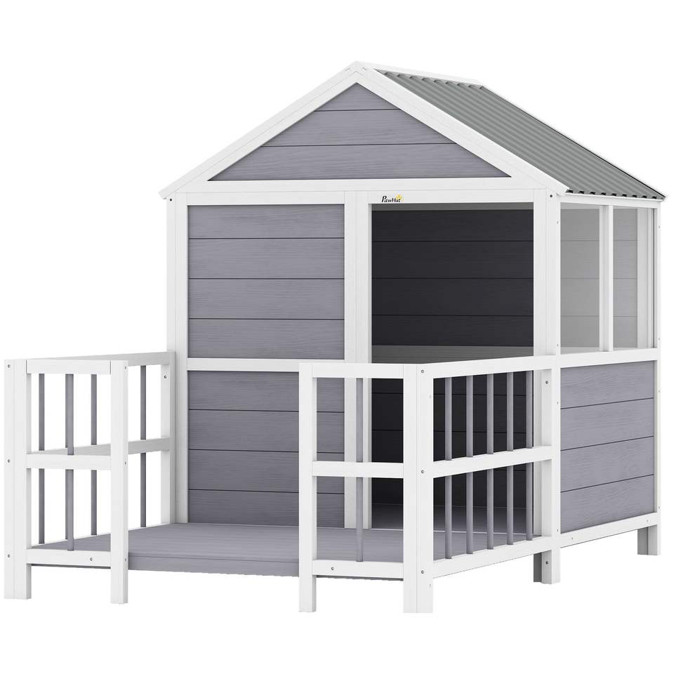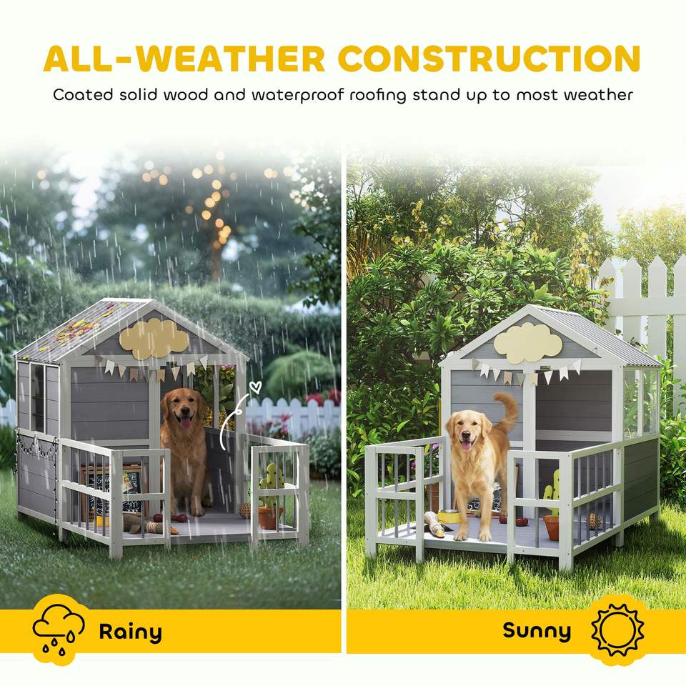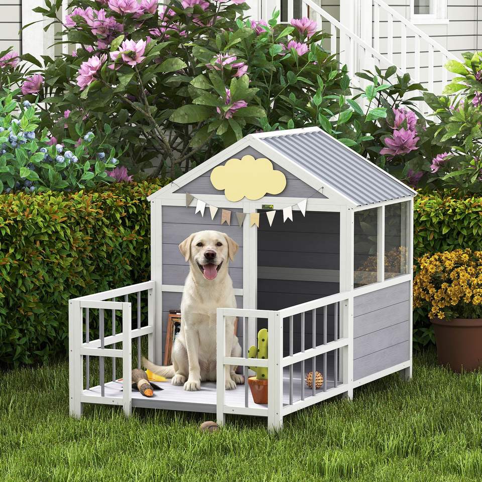 Cuccia per Cani da Esterno con Veranda, 61 Pollici, in Legno, Tetto Impermeabile, Base Rialzata, Prese d'Aria/Finestre di Osservazione