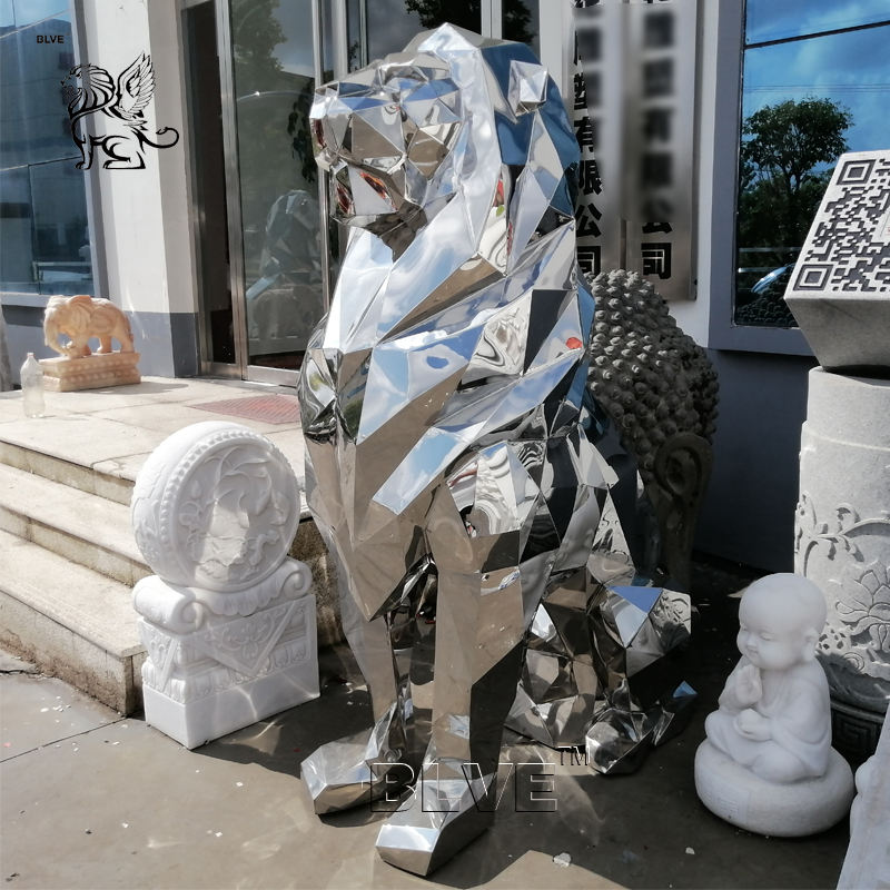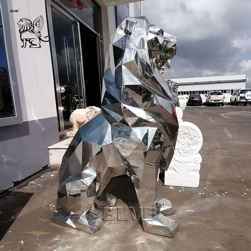 Decorazione dell'ingresso all'aperto arte moderna geometrica astratta a grandezza naturale animale scultura di statue di leoni in acciaio inossidabile