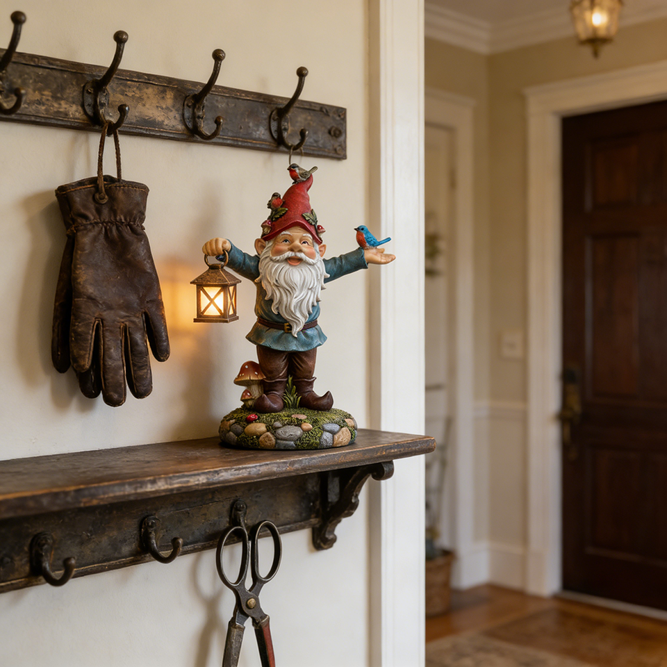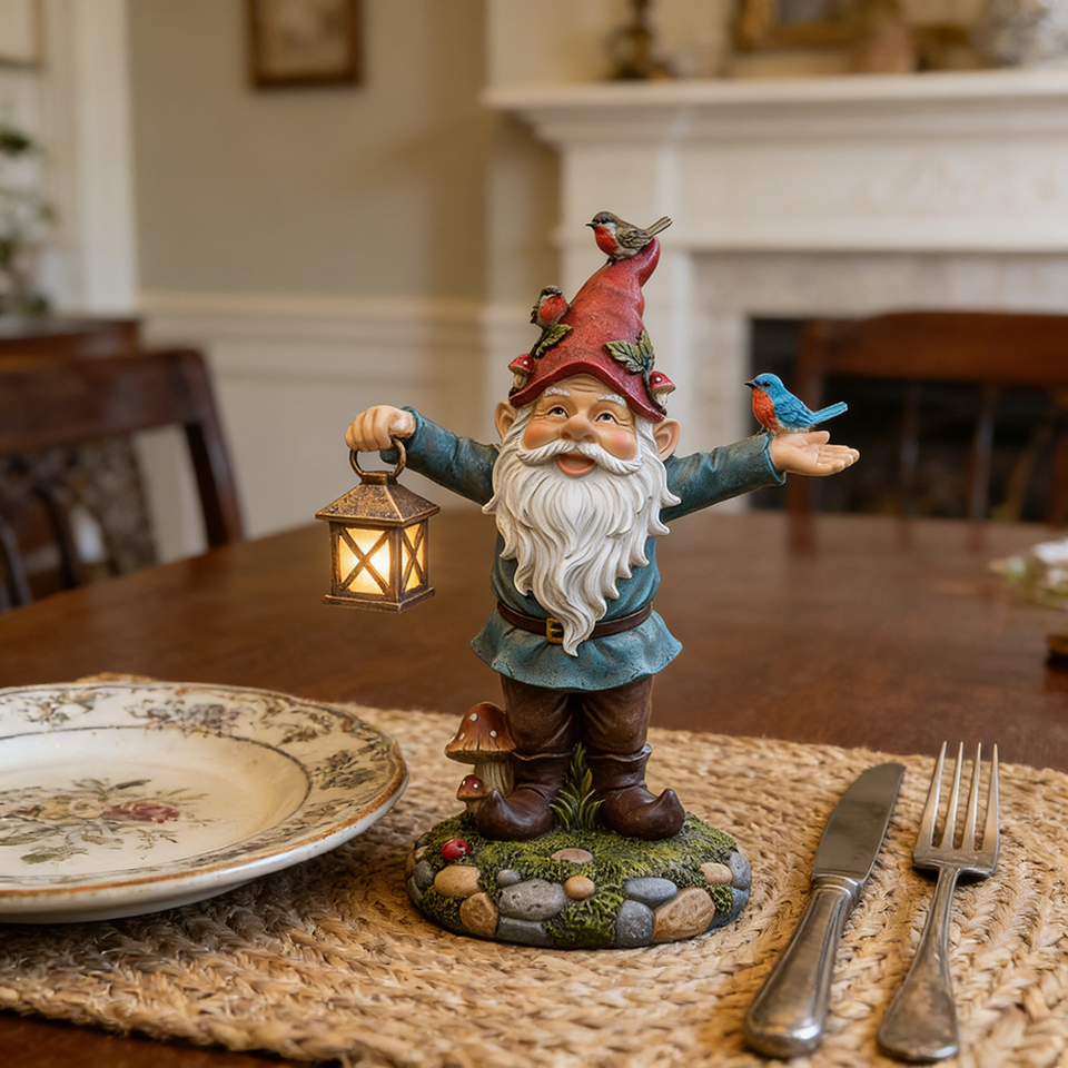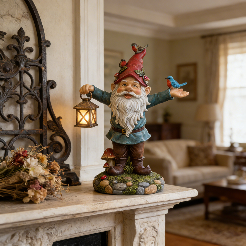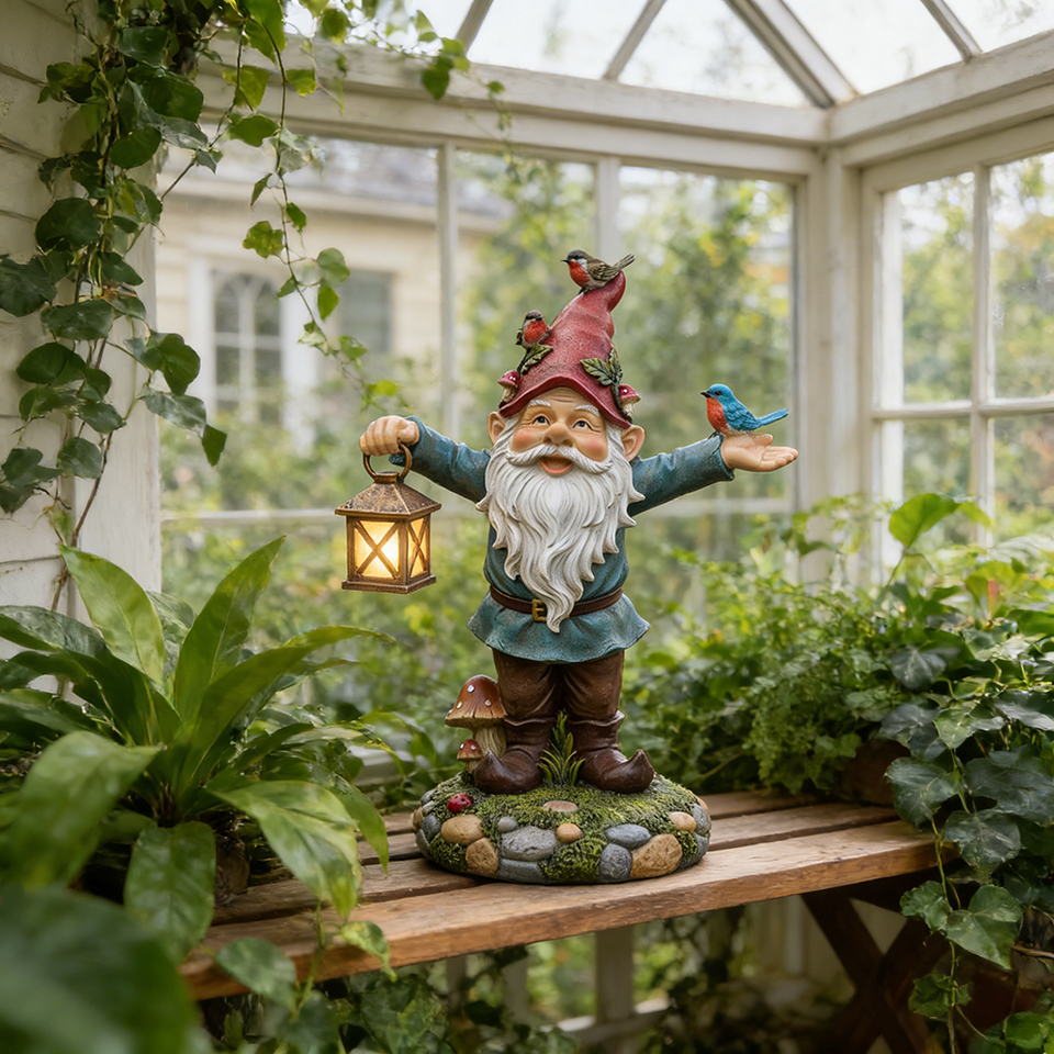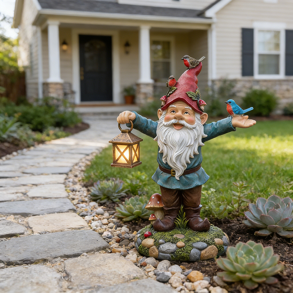 Outdoor Garden Gnome Statue with Solar Lantern, Waterproof Resin Dwarf Figurine with Birds for Patio Yard Lawn Decorations