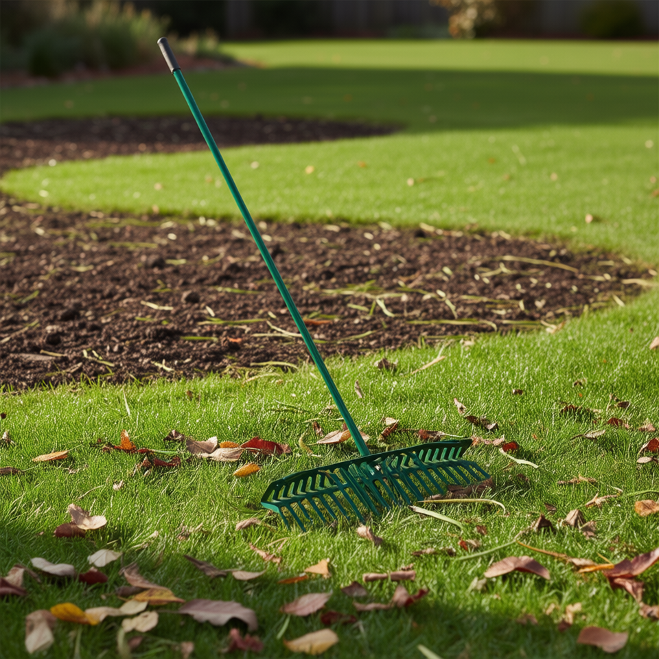 Rastrello livellante da giardino per esterni con testa in acciaio verde per la cura del prato e della fattoria