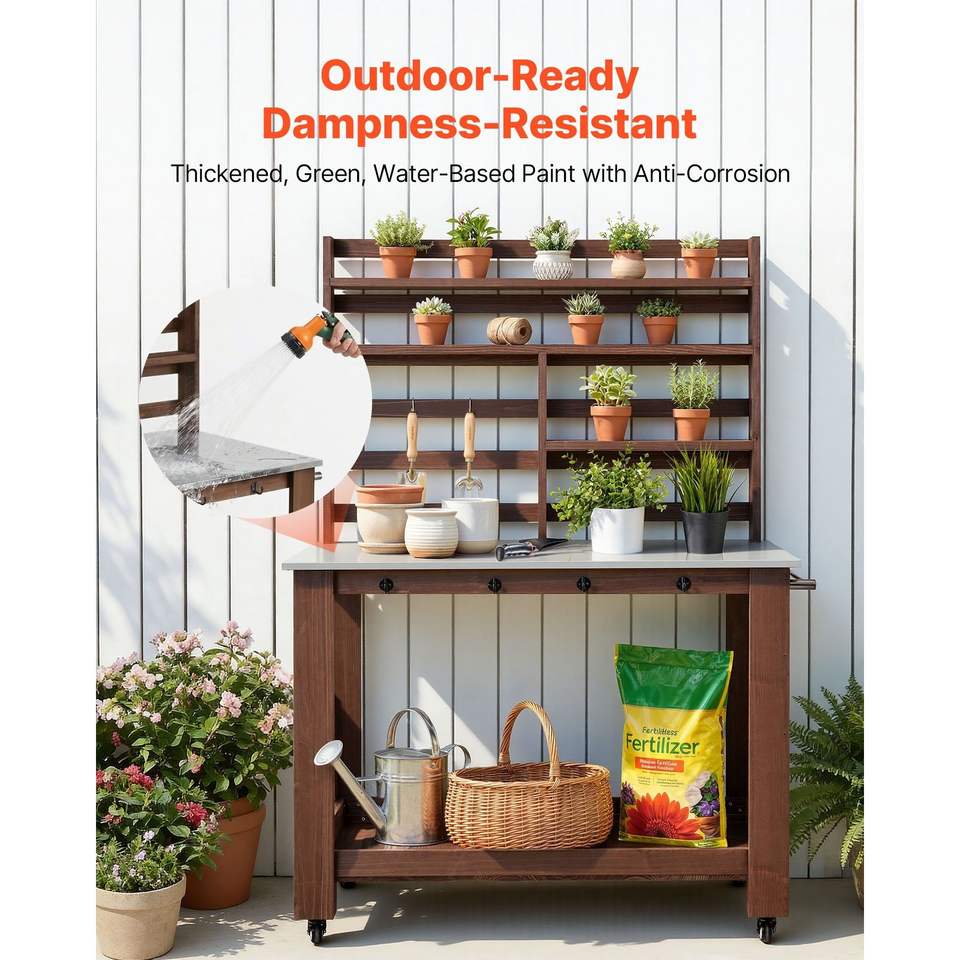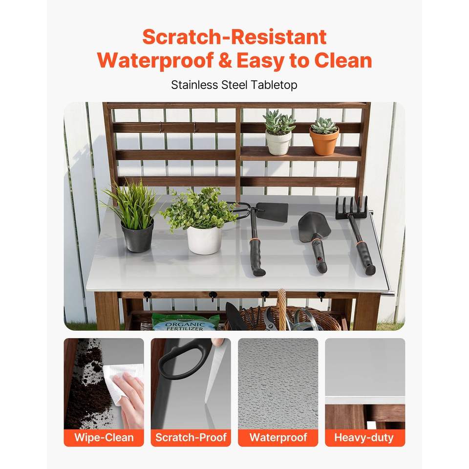 Tavolo da Lavoro per Giardinaggio con Piano in Acciaio Inox 45 x 26, 4 Ruote, Ganci e Ripiani Portaoggetti