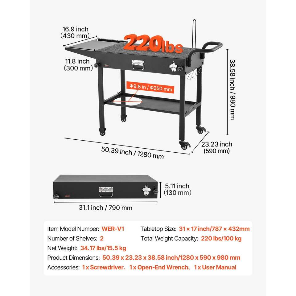 Carrello per Barbecue da Esterno con Piano Pieghevole 31.0 X 17.0 Pollici, Porta Tovaglioli e Ganci Inclusi