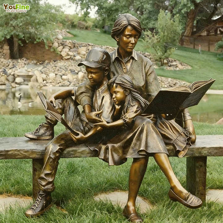 Statue in Bronzo a Grandezza Naturale per Esterni, Scultura Madre e Figli che Leggono un Libro, per Decorazione Giardino