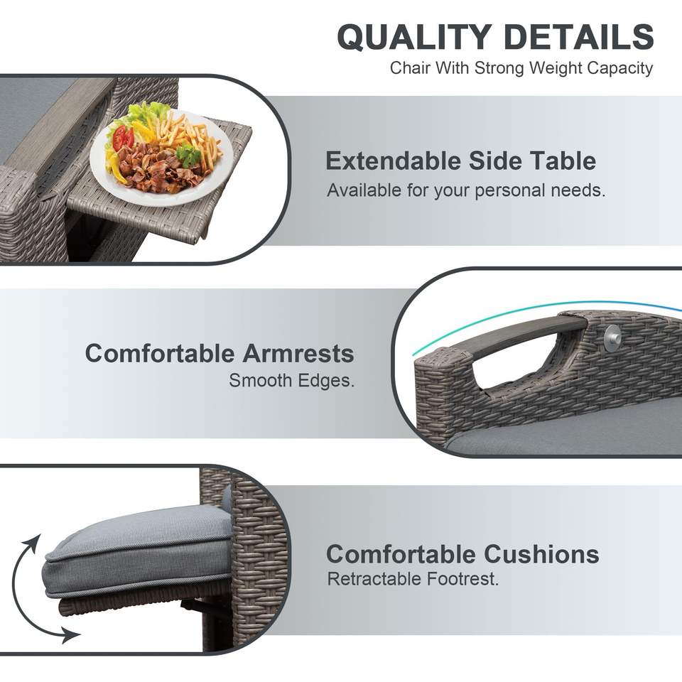 Sedia Reclinabile da Esterno con Tavolino Pieghevole, in Vimini Intrecciato a Mano, Angolo Regolabile, Cuscini Spessi 6,8 cm per Uso in Giardino