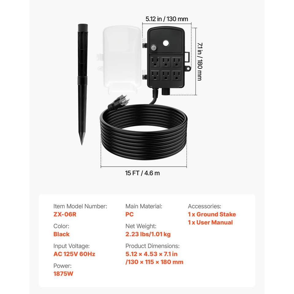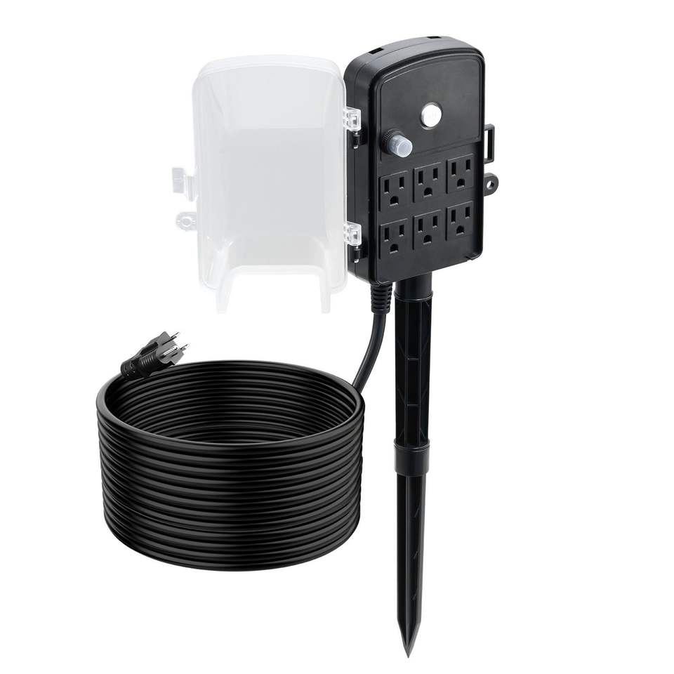 Cavo di prolunga per esterni da 25 piedi con 6 prese 15A, copertura resistente alle intemperie, protezione da sovraccarico, coperture per illuminazione da 25 piedi