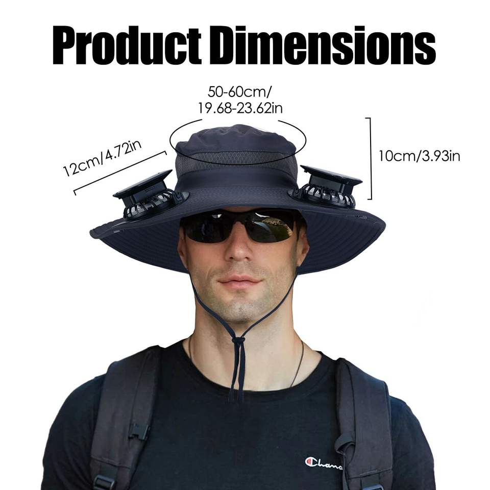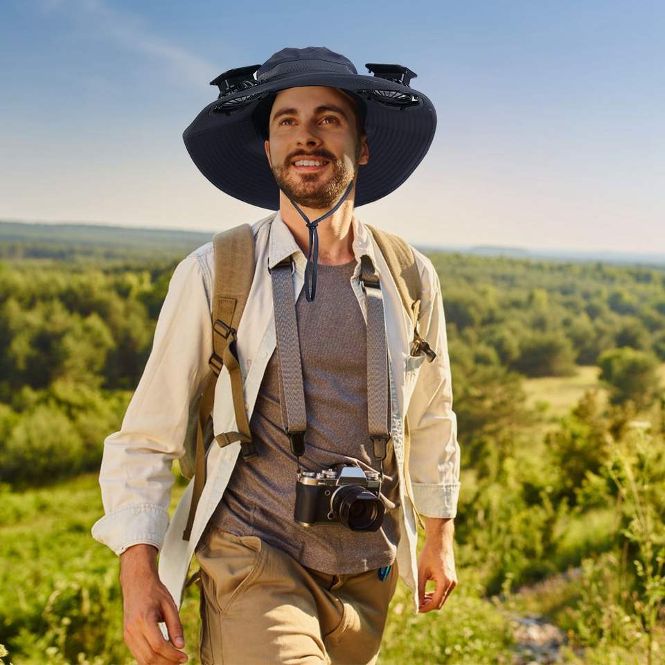 Cappello da Sole Outdoor UPF50+ a Tesa Larga con 2 Ventole Ricaricabili ad Energia Solare, 3 Velocità del Vento, Traspirante, Impermeabile, in Nylon a Rete