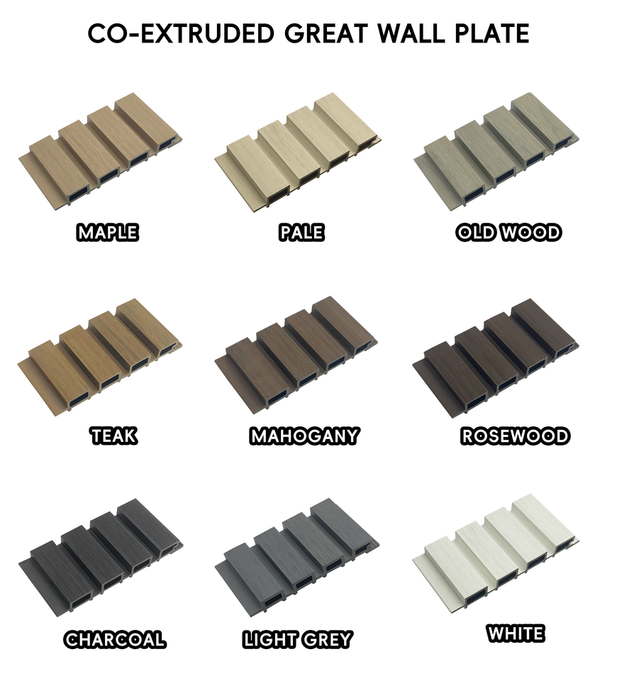 Outdoor Waterproof Wood Plastic Composite (WPC) Wall Panels Co-extrusion Flute Ceiling Panel Strip PVC Exterior Wood Cladding