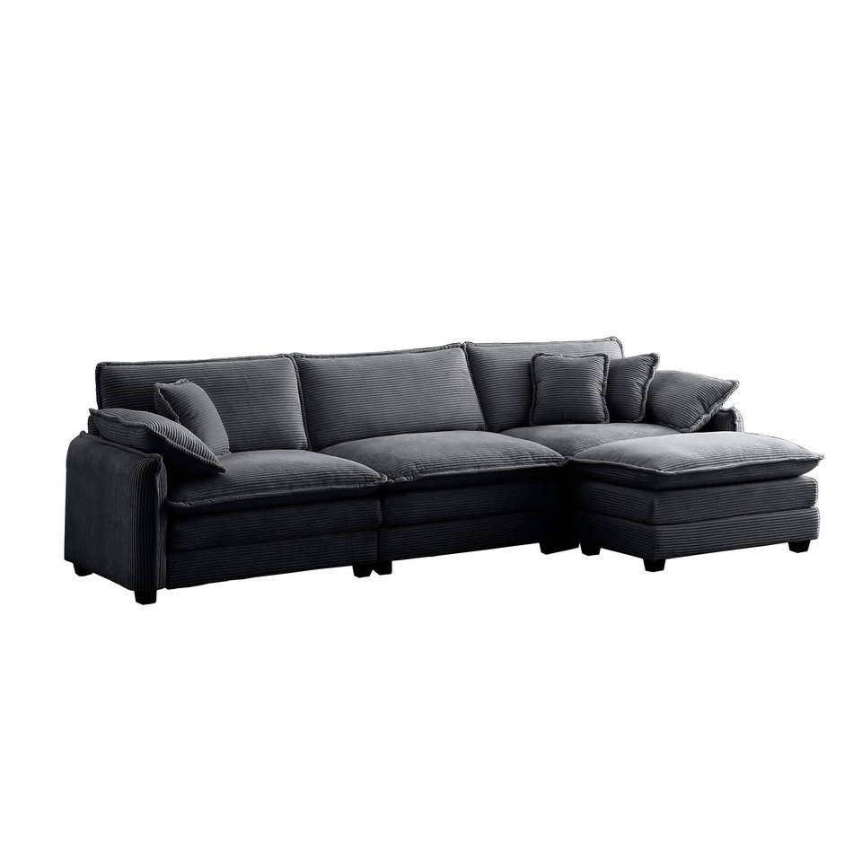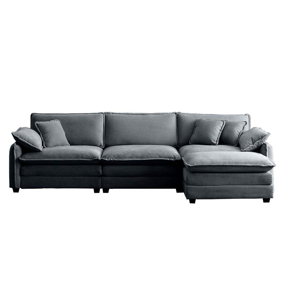 Divano Sezionale a L Oversize a 3 Posti in Corduroy Grigio con Poggiapiedi e Pouf per Soggiorni